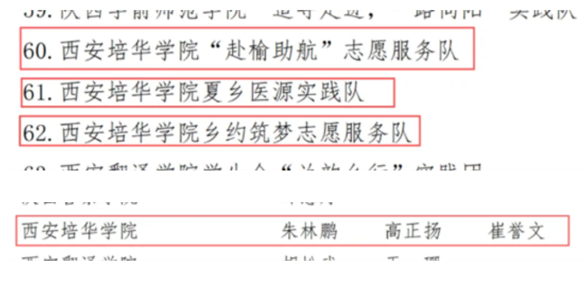 其中,西安培华学院荣获省级示范学校,学校“赴榆助航”志愿服务队、夏乡医源实践队、乡约筑梦志愿服务队荣获省级优秀团队,人文与国际教育学院老师朱林鹏、培华学子高正扬和崔誉文获省级先进个人。
