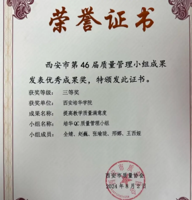西安培华学院QC质量管理小组荣获“西安市第46届质量管理小组优秀成果奖”