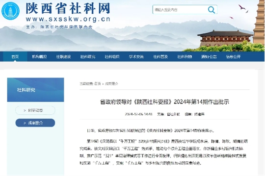 省政府领导对《陕西社科要报》2024年第14期作出批示(陕西省社科网截图)