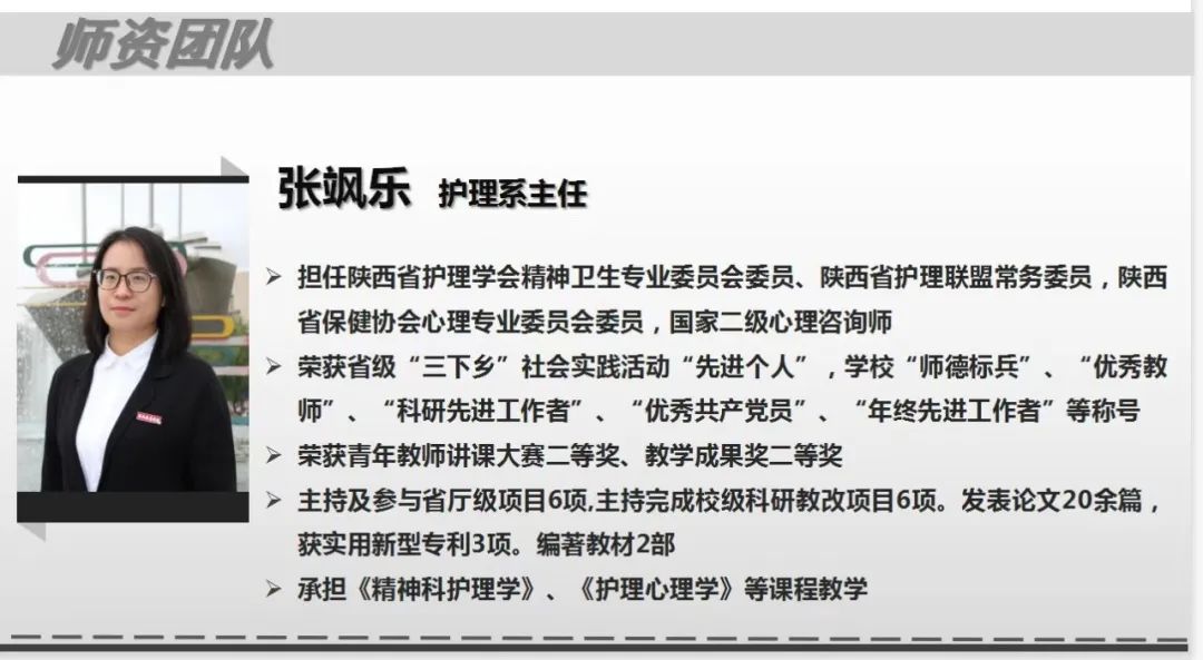 护理专业拥有一支学术水平高、结构合理的师资队伍,被评为校级教学团队,有国家级教学成果特等奖获得者、国家精品课程负责人、国家和省级学术组织常委、省级教学名师等。
