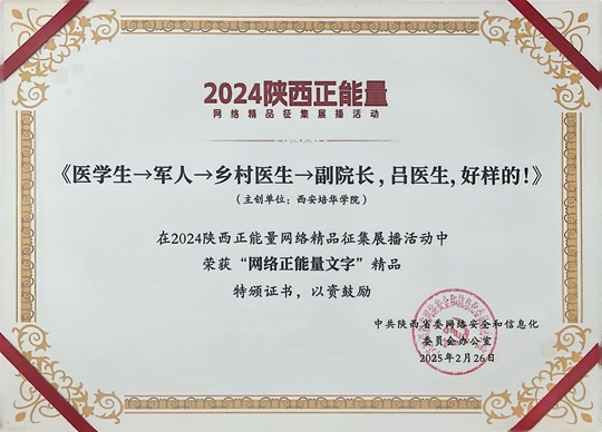 2月26日,陕西省委网信办组织召开2025网上宣传工作推进会,并向荣获2024陕西正能量网络精品的单位颁发证书和奖杯。西安培华学院凭借作品《医学生→军人→乡村医生→副院长,吕医生,好样的!》在2024 陕西正能量网络精品征集展播活动中,荣获“网络正能量文字”精品殊荣。