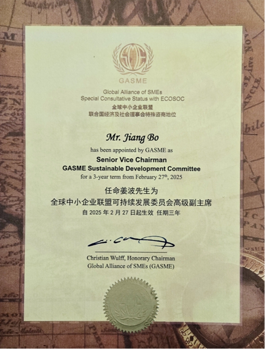 会上,西安培华学院姜波理事长受聘为全球中小企业联盟可持续发展委员会高级副主席,武尔夫先生为其颁发聘书。