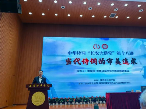 2025年3月15日,由陕西省诗词学会主办,西安培华学院及学校人文与国际教育学院承办的中华诗词“长安大讲堂”第十八讲,在西安培华学院维之图书馆报告厅圆满举行。本次讲座聚焦“当代诗词的审美追求”,特邀中华诗词学会学术部原副主任李葆国先生担纲主讲。来自全国各地的诗词爱好者、西安培华学院人文与国际教育学院中文系全体教师以及部分学生,共计400余人齐聚一堂,共享这场诗词盛宴。