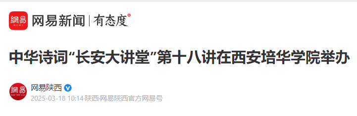 诗词,作为中华文化的璀璨瑰宝,承载着中华民族深厚的精神底蕴与审美追求。本次讲座不仅让西安培华学院师生近距离领略了诗词的独特魅力,深入了解中华优秀传统文化的博大精深,更在校园内营造出“爱诗词、学诗词、创诗词”的浓厚氛围,有力推动了书香校园建设。同时,陕西省诗词学会作为西安培华学院的实践基地,本次活动也是校企深度合作的典范之作。讲座的成功举办,显著提升了西安培华学院的文化影响力,充分彰显了学校对中华优秀传统文化的高度重视以及在传统文化教育领域取得的丰硕成果。