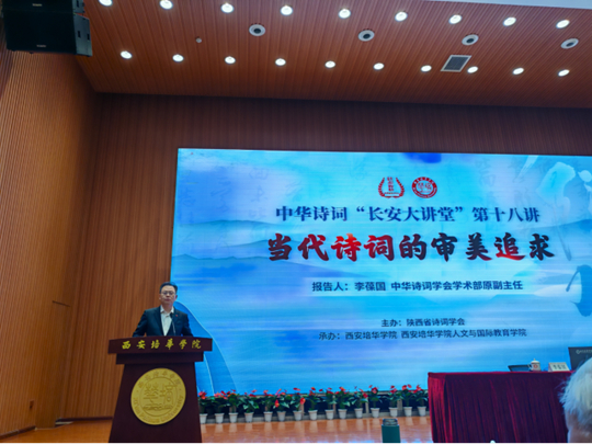 2025年3月15日,由陕西省诗词学会主办,西安培华学院及人文与国际教育学院承办的中华诗词“长安大讲堂”第十八讲,在西安培华学院维之图书馆报告厅圆满举行。本次讲座聚焦“当代诗词的审美追求”,特邀中华诗词学会学术部原副主任李葆国先生担纲主讲。来自全国各地的诗词爱好者、西安培华学院人文与国际教育学院中文系全体教师以及部分学生,共计400余人齐聚一堂,共享这场诗词盛宴。