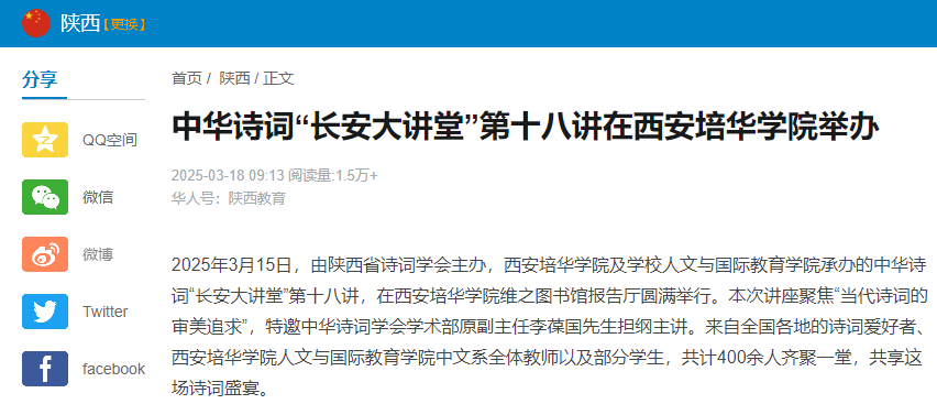 诗词,作为中华文化的璀璨瑰宝,承载着中华民族深厚的精神底蕴与审美追求。本次讲座不仅让西安培华学院师生近距离领略了诗词的独特魅力,深入了解中华优秀传统文化的博大精深,更在校园内营造出“爱诗词、学诗词、创诗词”的浓厚氛围,有力推动了书香校园建设。同时,陕西省诗词学会作为西安培华学院的实践基地,本次活动也是校企深度合作的典范之作。讲座的成功举办,显著提升了西安培华学院的文化影响力,充分彰显了学校对中华优秀传统文化的高度重视以及在传统文化教育领域取得的丰硕成果。