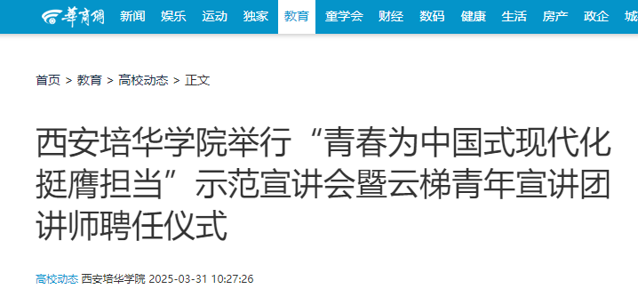 凝聚青年共识,激发使命担当。3月26日,由西安培华学院党委宣传部、党委学生工作部、校团委等多部门协同联动,人文与国际教育学院团委承办的“青春为中国式现代化挺膺担当”示范宣讲会暨云梯青年宣讲团讲师聘任仪式在维之图书馆报告厅举行。这场以青年学生为主体的思想盛宴吸引了全省12所兄弟院校师生及宣讲团成员共500余人参与,搭建校际联动育人平台。