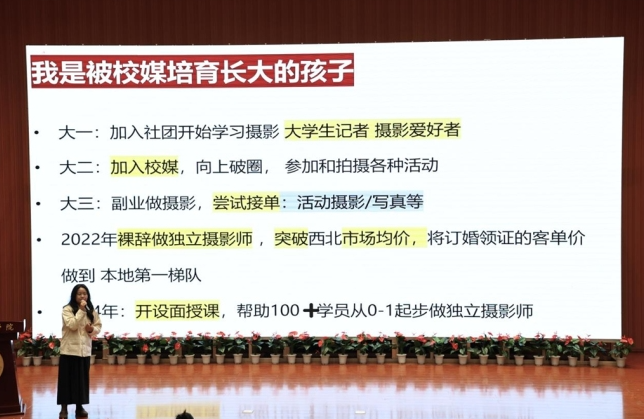 如何用镜头讲好校园故事?如何用光影传递青春温度?活动最后,独立摄影师、校媒学姐张婷(壳郎)带来构图、光线、审美积累等摄影技巧与视觉表达的分享。作为“从校媒长大的孩子”,她讲述了自己从大学生摄影记者到上班族再到将摄影变为事业的转型故事,展示了校媒人的无限可能。“允许自己有一个粗糙的开始,先完成,再完美。”她鼓励同学们积极同优秀的人交流学习,不要因为别人的成就而打乱了自己的节奏,坚定走下去,自会有收获。