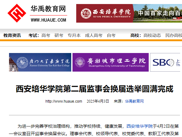 为进一步完善学校治理结构,推动学校持续、健康发展,西安培华学院于4月2日在第一会议室召开监事会换届会议。理事会代表、校领导代表、校党委代表、教职工代表及第一届监事会全体成员共同见证此次换届,为学校的长远发展筑牢根基。会议由纪委书记陈玲主持。