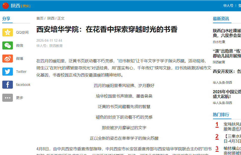培华学院始终致力于传承文化、培养人才,打造书香校园,用格调高雅的优秀文化引导人、培育人。