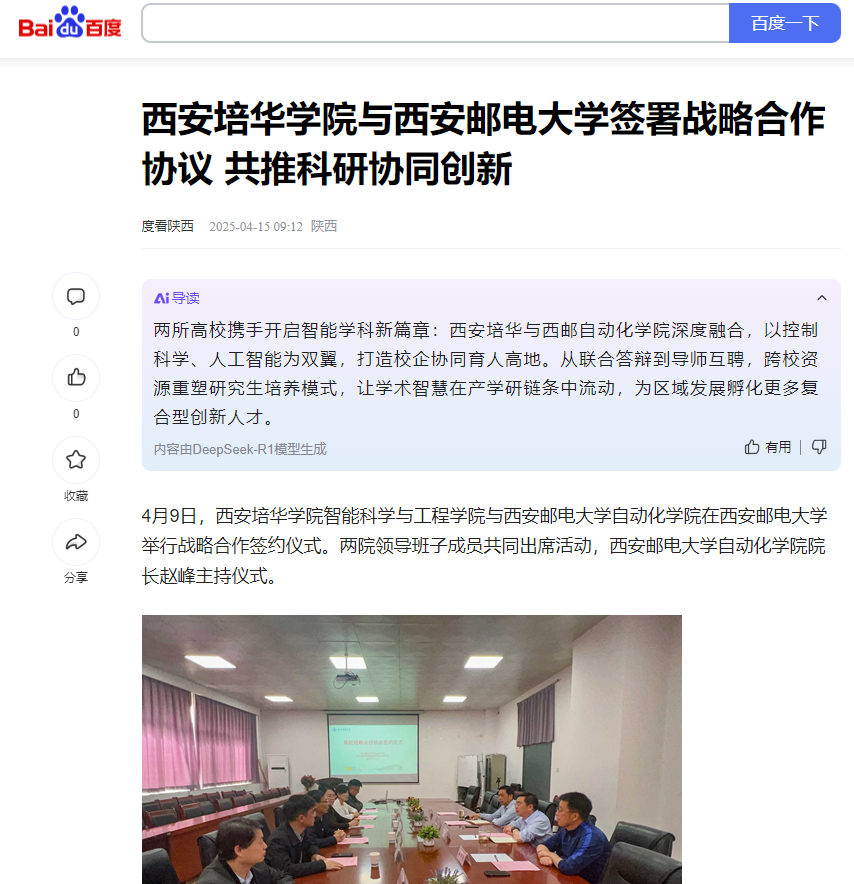 4月9日,西安培华学院智能科学与工程学院与西安邮电大学自动化学院在西安邮电大学举行战略合作签约仪式。两院领导班子成员共同出席活动,西安邮电大学自动化学院院长赵峰主持仪式。