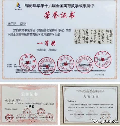 杨子涵在第十六届全国美育教学成果展评获一等奖、四校书画联展获银奖等。每一份作品或笔走龙蛇、飘逸生风,或细腻温婉、规矩谨然,一笔一划,尽显他对书法艺术的独到见解,字里行间,可窥他传统与创新并存的文人风骨。这些奖项不是终点,而是墨香长卷里的朱砂批注。他坦言最让他珍视的,是春节为家乡老人手写春联时,王奶奶那句“娃娃的字比印刷的更有温度”。