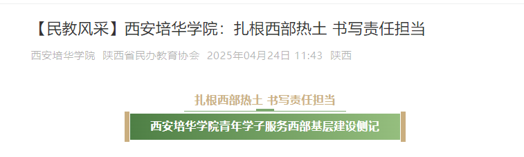 西安培华学院于在风起云涌的大革命时代诞生,在抗战烽火中升华,在共和国旗帜下成长,在改革开放浪潮中奋进,在新时代逐梦中图强。一代代培华人用救国之心、爱国之举、报国之情、兴国之梦、强国之志创建了培华昨天的辉煌,描绘了培华明天的希望。历史的接力棒又交到新一代培华人手上。迈步在中华民族伟大复兴征程上的培华青年用行动证明:选择基层不是选择平凡,而是选择成为时代的脊梁;扎根西部不是单向奉献,而是在广阔天地中实现人生价值的升华。这种双向奔赴,正是新时代青年最动人的姿态。