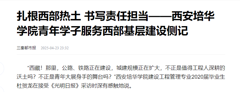 “西藏!那里,公路、铁路正在建设,城建规模正在扩大,不正是值得工程人深耕的沃土吗?不正是青年大展身手的舞台吗?”西安培华学院建设工程管理专业2020届毕业生杜贺龙在接受《光明日报》采访时深有感触地说。
