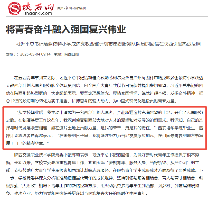 “从学校毕业后,我主动申请成为一名西部计划志愿者,奔赴新疆这片充满希望的土地,开启了志愿服务之路。在新疆基层工作这些年,我深刻感受到西部大地对人才的渴望和对发展的迫切需求。我深知,自己的选择与时代发展紧密相连,能在这片土地上贡献力量,是我的荣幸,更是我的责任。”西安培华学院毕业生、西部计划志愿者肖泽鸿表示,“在未来的日子里,我将继续努力为当地发展添砖加瓦,在祖国最需要的地方书写属于自己的精彩华章。”