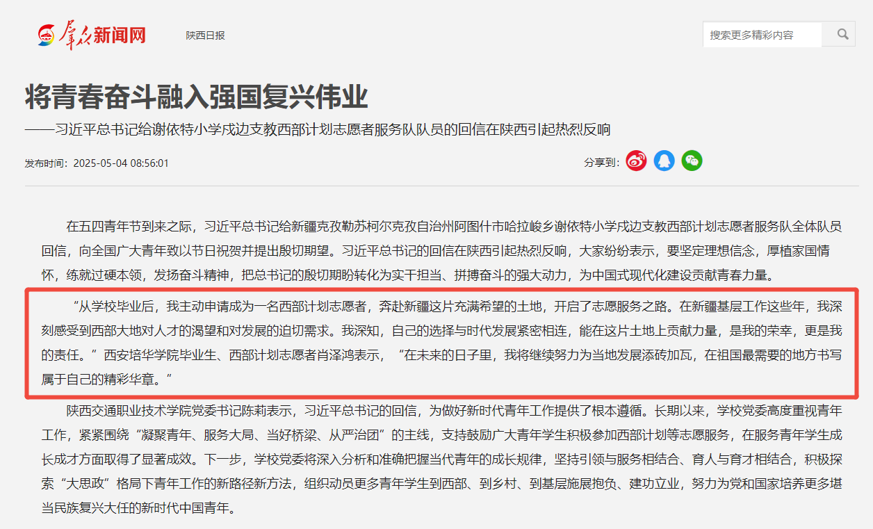 在五四青年节到来之际,习近平总书记给新疆克孜勒苏柯尔克孜自治州阿图什市哈拉峻乡谢依特小学戍边支教西部计划志愿者服务队全体队员回信,向全国广大青年致以节日祝贺并提出殷切期望。习近平总书记的回信在陕西引起热烈反响,大家纷纷表示,要坚定理想信念,厚植家国情怀,练就过硬本领,发扬奋斗精神,把总书记的殷切期盼转化为实干担当、拼搏奋斗的强大动力,为中国式现代化建设贡献青春力量。