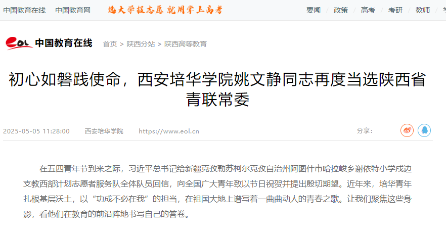 在五四青年节到来之际,习近平总书记给新疆克孜勒苏柯尔克孜自治州阿图什市哈拉峻乡谢依特小学戍边支教西部计划志愿者服务队全体队员回信,向全国广大青年致以节日祝贺并提出殷切期望。近年来,西安培华学院青年扎根基层沃土,以“功成不必在我”的担当,在祖国大地上谱写着一曲曲动人的青春之歌。让我们聚焦这些身影,看他们在教育的前沿阵地书写自己的答卷。