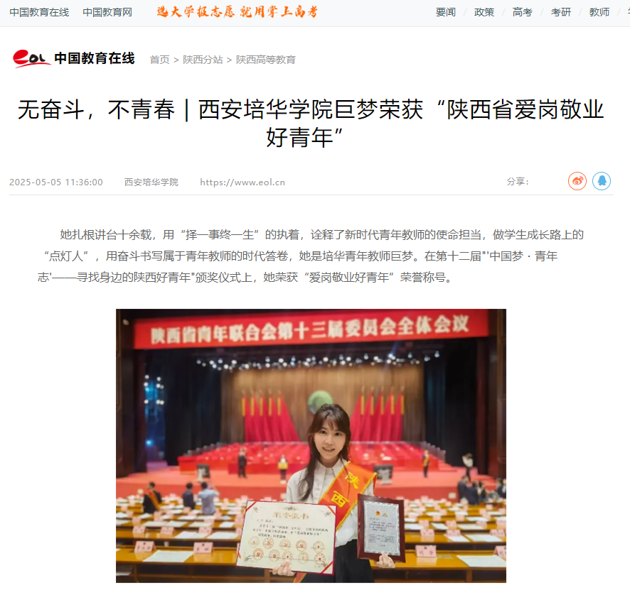 她扎根讲台十余载,用“择一事终一生”的执着,诠释了新时代青年教师的使命担当,做学生成长路上的“点灯人”,用奋斗书写属于青年教师的时代答卷,她是培华青年教师巨梦。在第十二届"'中国梦・青年志'——寻找身边的陕西好青年"颁奖仪式上,她荣获“爱岗敬业好青年”荣誉称号。