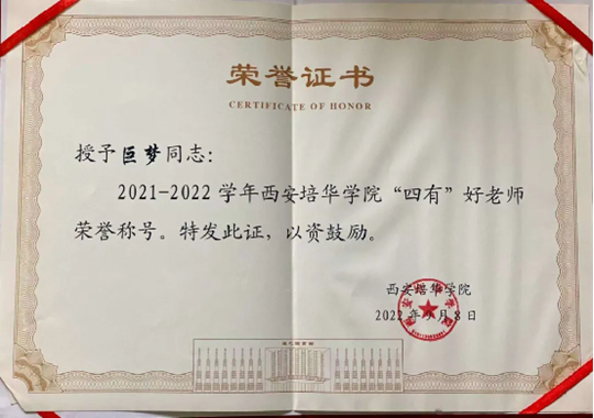她扎根讲台十余载,用“择一事终一生”的执着,诠释了新时代青年教师的使命担当,做学生成长路上的“点灯人”,用奋斗书写属于青年教师的时代答卷,她是培华青年教师巨梦。在第十二届"'中国梦・青年志'——寻找身边的陕西好青年"颁奖仪式上,她荣获“爱岗敬业好青年”荣誉称号。