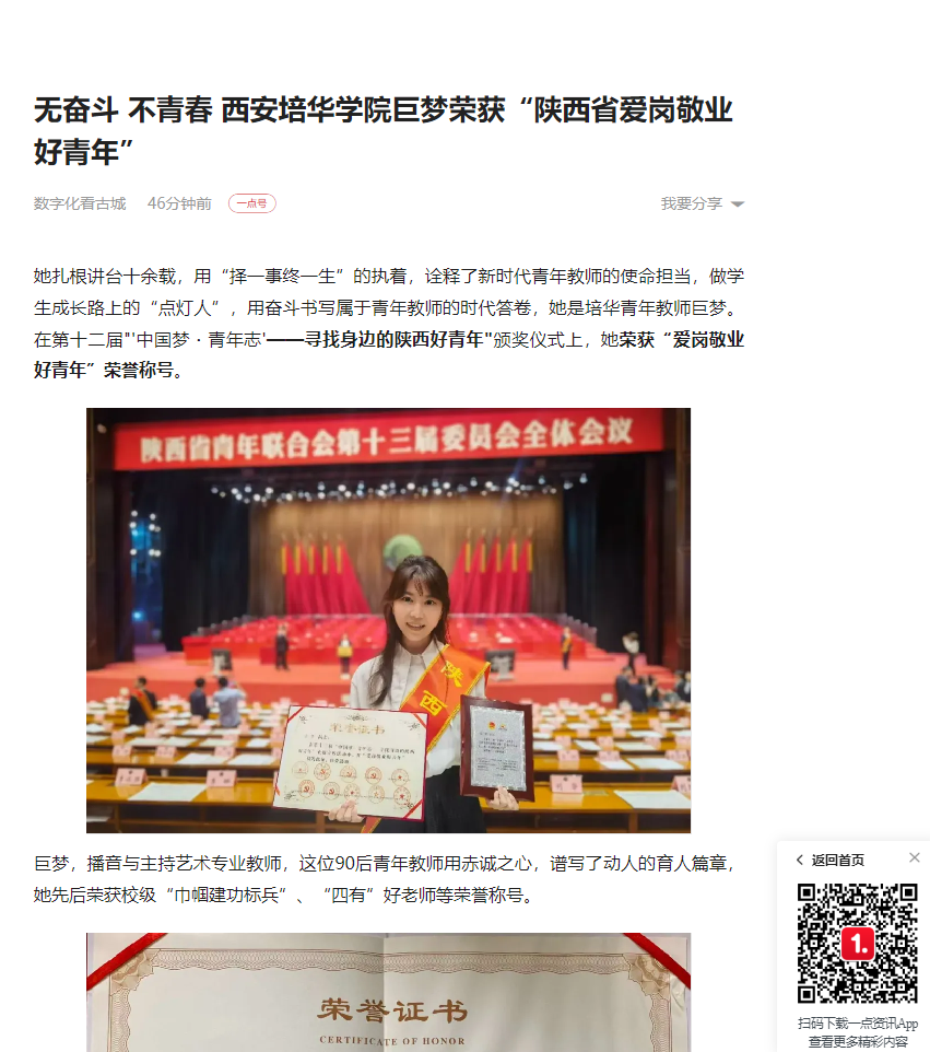 一点资讯:无奋斗 不青春 西安培华学院巨梦荣获“陕西省爱岗敬业好青年”