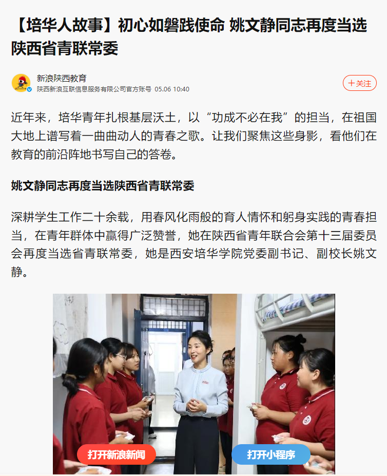 据悉,近年来,西安培华学院青年扎根基层沃土,以“功成不必在我”的担当,在祖国大地上谱写着一曲曲动人的青春之歌。该校理事长姜波曾说,培华人在哪里奋斗,培华的精神就在哪里闪光。