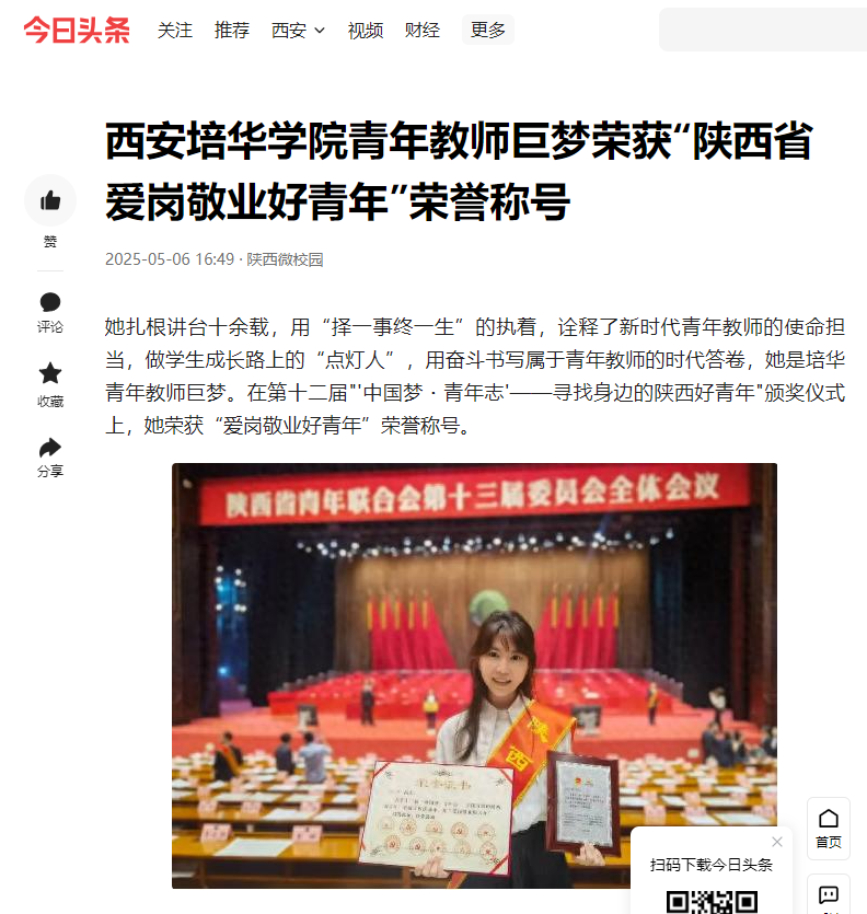 今日头条:西安培华学院青年教师巨梦荣获“陕西省爱岗敬业好青年”荣誉称号