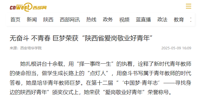 她扎根讲台十余载,用“择一事终一生”的执着,诠释了新时代青年教师的使命担当,做学生成长路上的“点灯人”,用奋斗书写属于青年教师的时代答卷,她是培华青年教师巨梦。在第十二届"'中国梦・青年志'——寻找身边的陕西好青年"颁奖仪式上,她荣获“爱岗敬业好青年”荣誉称号。