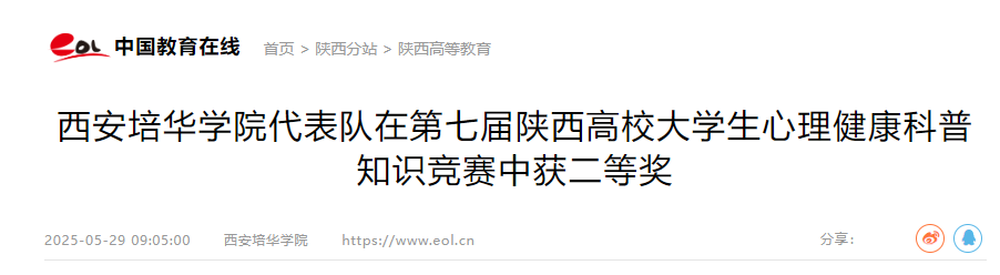 5月23日,由中共陕西省委教育工作委员会、陕西省教育厅主办,西安工程大学承办的第七届陕西高校大学生心理健康科普知识竞赛暨心理素质拓展运动嘉年华在西安工程大学落幕,由西安培华学院医学院王美蔺、智能科学与工程学院林晓玲、人文与国际教育学院韩渝璐三位同学组成的“识光培你”代表队凭借扎实的心理知识功底、出色的临场应变能力及默契的团队协作能力,从全省90余所高校、270名参赛选手中脱颖而出,荣获省级决赛二等奖。