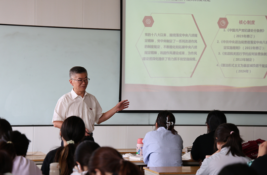课堂上,刘锋书记阐述了中央八项规定精神出台的时代背景及其主要内容。党的十八大以来,面对党内存在的形式主义、官僚主义、享乐主义和奢靡之风等突出问题,以习近平同志为核心的党中央从制定和执行中央八项规定开局破题,以“得罪千百人、不负十四亿”的使命担当祛疴治乱,充分彰显了我们党勇于自我革命、从严管党治党的坚定决心。中央八项规定的出台实施,是新时代党的建设的重要举措,对于改进工作作风、密切联系群众、加强党风廉政建设具有重大而又深远的历史意义。