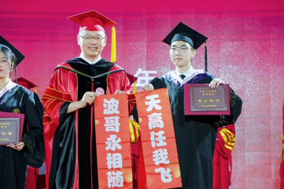 流苏刚定格肩左,有学子突然掏出手幅,“天高任我飞,波哥永相随!”可爱标语撞碎典礼庄重感,体育馆穹顶炸开青春回响。