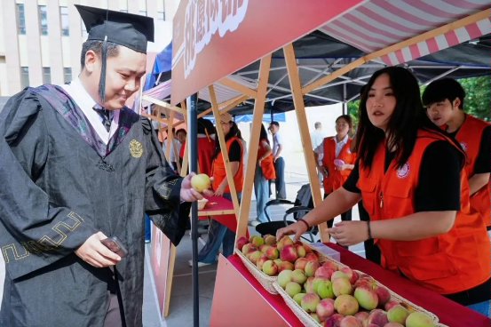学子们接过学位证,变戏法般捧出竹编小篮,红桃黄李卧在绶带金穗间,寓意“桃李不言,下自成蹊”的育人传奇。