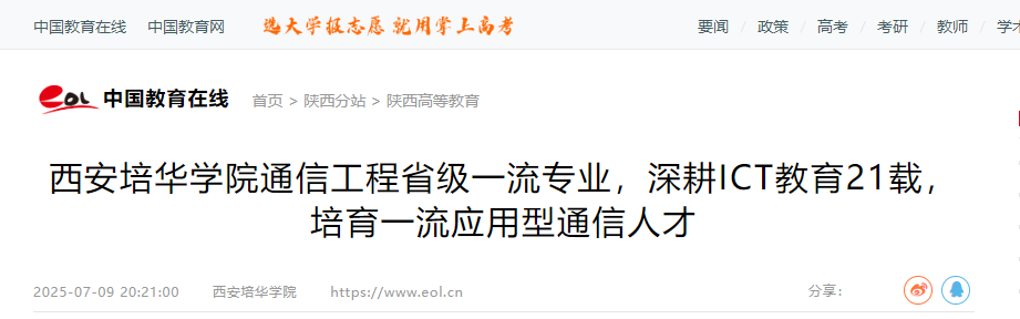 西安培华学院通信工程本科专业自2004年获教育部批准设立以来,持续深化教育教学改革,先后获批陕西省“应用型人才培养模式创新实验区”“省级综合改革试点专业”,2017年获批为省级一流专业培育项目,2019年获批为省级一流专业建设点。专业实力备受认可,被艾瑞森校友会评为通信工程专业2025中国六星级应用型专业(6★,A++),跻身中国顶尖应用型专业行列,雄居校友会2025中国大学通信工程专业排名(应用型)首位,综合排名与办学水平顶尖。专业建设多点突破:获批教育部“第二学士学位教育资格”,入选首批开展国际工程教育认证专业,专业教师团队荣获“省级教学团队”,专业实验室获批为“省级实验教学示范中心”,与西北大学共建的“电子与通信工程研究生联合培养工作站”获批为省级研究生培养示范工作站。