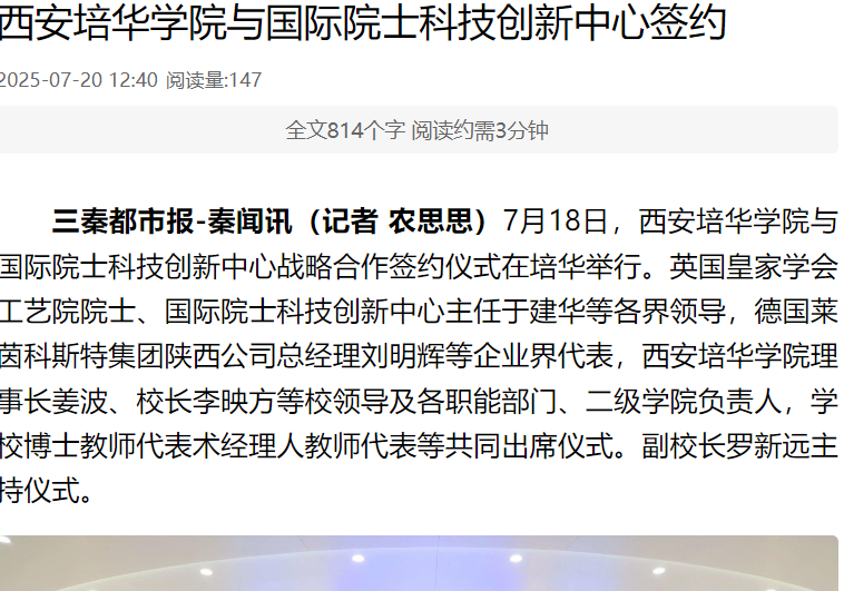 三秦都市报-秦闻讯(记者 农思思)7月18日,西安培华学院与国际院士科技创新中心战略合作签约仪式在培华举行。英国皇家学会工艺院院士、国际院士科技创新中心主任于建华等各界领导,德国莱茵科斯特集团陕西公司总经理刘明辉等企业界代表,西安培华学院理事长姜波、校长李映方等校领导及各职能部门、二级学院负责人,学校博士教师代表术经理人教师代表等共同出席仪式。副校长罗新远主持仪式。