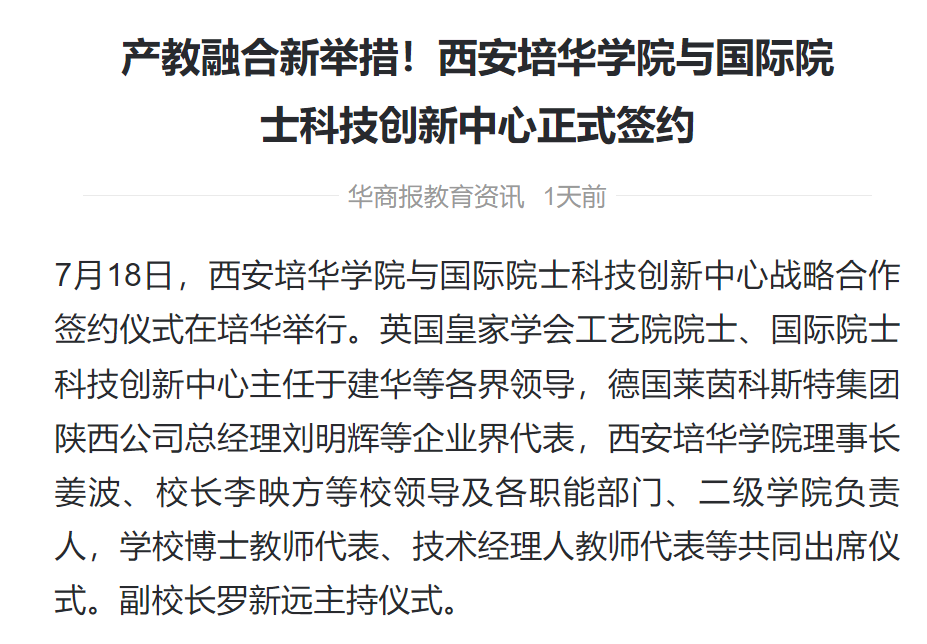 华商头条:产教融合新举措!西安培华学院与国际院士科技创新中心正式签约