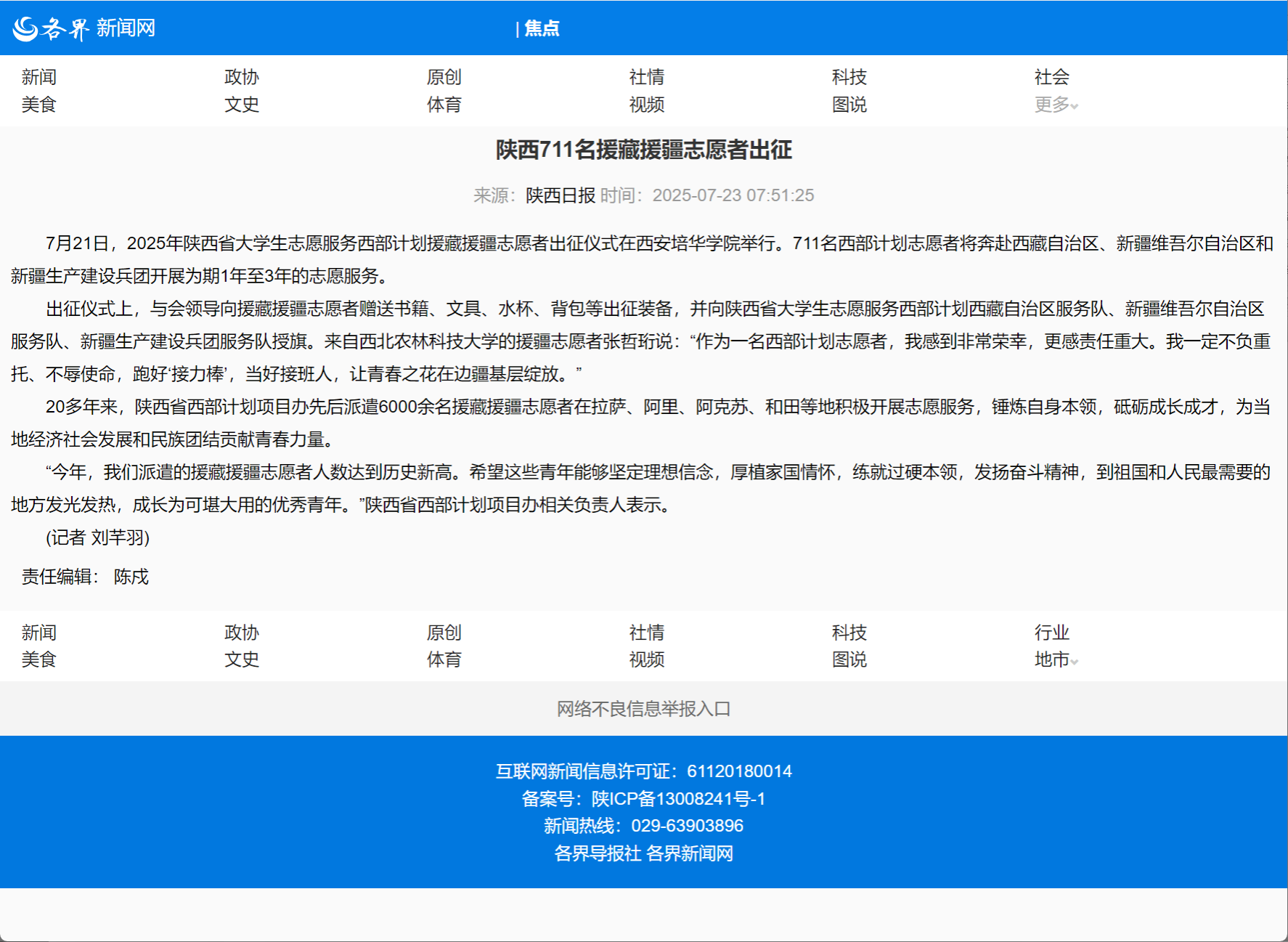 7月21日,2025年陕西省大学生志愿服务西部计划援藏援疆志愿者出征仪式在西安培华学院举行。711名西部计划志愿者将奔赴西藏自治区、新疆维吾尔自治区和新疆生产建设兵团开展为期1年至3年的志愿服务。