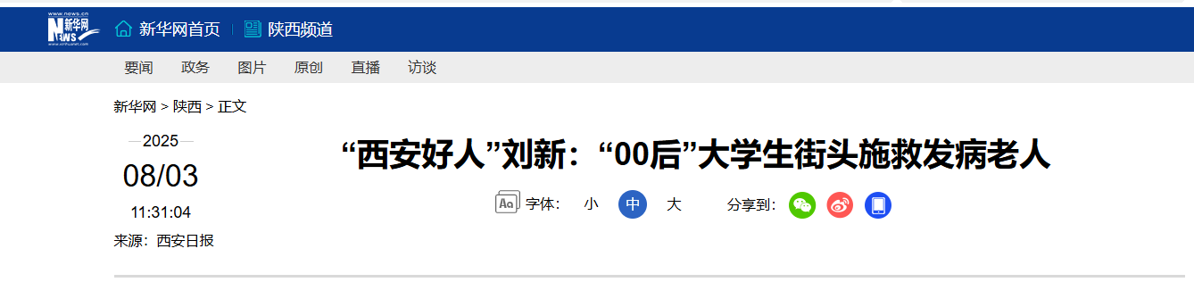 近日,记者在西安培华学院见到了护理学专业大二学生刘新。这个方圆脸、不善言辞的“00后”小伙儿曾在街头成功施救了一位突发疾病晕倒的老人,也因此获评2025年第二季度见义勇为“西安好人”。
