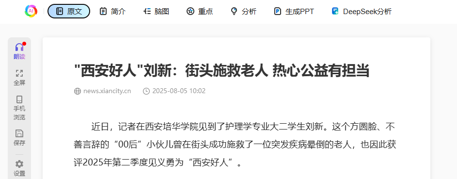 近日,记者在西安培华学院见到了护理学专业大二学生刘新。这个方圆脸、不善言辞的“00后”小伙儿曾在街头成功施救了一位突发疾病晕倒的老人,也因此获评2025年第二季度见义勇为“西安好人”。