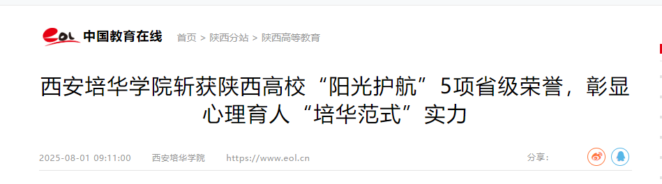 十年耕耘,初心如磐。在刚刚揭晓的第十届陕西高校“阳光护航”心理育人宣传季实践活动成果中,西安培华学院的老师们,以扎实的专业积淀与温暖的育人实践收获省级荣誉5项,其中一等奖1项,二等奖4项,这份沉甸甸的认可,不仅是对老师们默默付出的肯定,更是学校长期深耕心理育人沃土,探索形成特色“培华范式”的生动注脚。