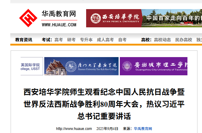 9月3日,纪念中国人民抗日战争暨世界反法西斯战争胜利80周年大会在北京天安门广场隆重举行。西安培华学院组织师生代表通过多种方式收看了大会直播盛况,共同见证了这一具有重大历史意义的时刻。