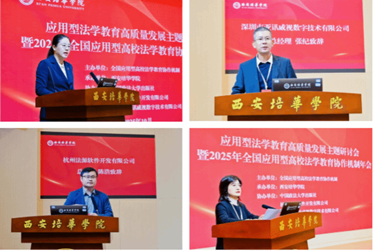 西安培华学院法学院副院长赵洁主持开幕式。西安培华学院校长李映方致欢迎词,他表示希望和与会嘉宾共同探讨产教融合新模式,共享实务教学新经验,在课程改革、师资建设、实训平台搭建等方面凝聚共识、形成合力。此外,杭州法源软件开发有限公司总经理陈浩和深圳市亚讯威视数字技术有限公司总经理张纪分别致辞,他们提出将借助各类软件和技术助力应用型法学专业建设与发展。