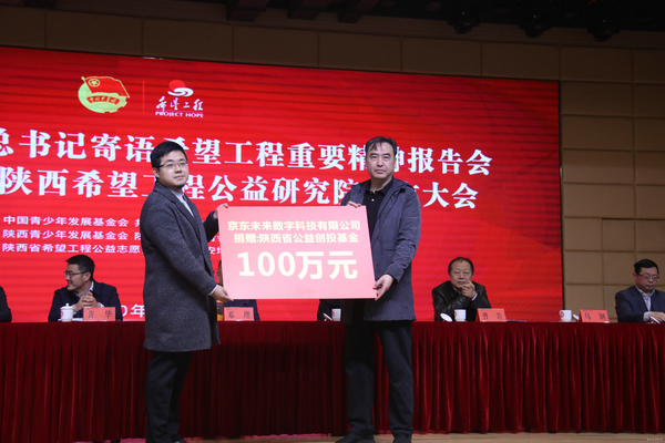 报告会上举行了全国高校首家希望工程公益研究院——西安培华学院陕西希望工程公益研究院揭牌活动,京东未来数字科技有限公司向陕西希望工程捐赠100万元公益创投基金,用于孵化、培育、资助希望工程青少年公益项目。