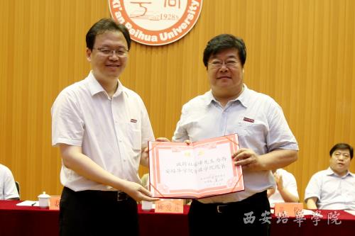 姜波理事长代表学校向中国新闻文化促进会副会长、陕西新闻摄影学会会长、西北大学新闻学研究院院长杜耀峰先生颁发传媒学院院长聘书