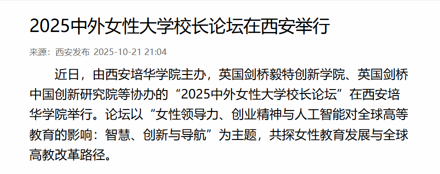 10月18日至19日,由西安培华学院主办,英国剑桥毅特创新学院、英国剑桥中国创新研究院协办,联合国学术影响力、中国教育技术协会、中国教育国际交流协会、中国技术管理协会等机构支持的“2025中外女性大学校长论坛”在西安培华学院举行。论坛以“女性领导力、创业精神与人工智能对全球高等教育的影响:智慧、创新与导航”为核心主题,共商女性教育发展与全球高等教育改革路径。