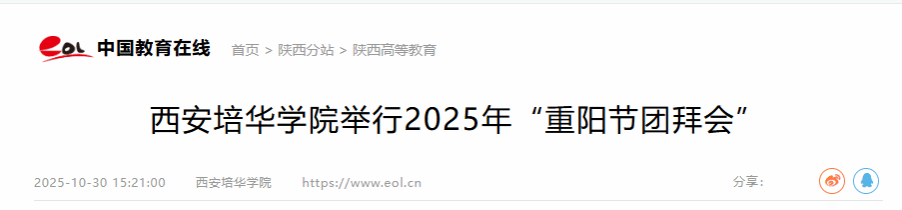 重阳节不仅是传统的延续,更是培华精神的礼赞。老一辈的智慧与奉献,如明灯照亮后辈前行的道路;年轻一代的活力与创新,则为学校注入源源不断的生机。 西安培华学院将继续秉持“敬老、爱老、助老”的优良传统,不忘初心、牢记使命,落实立德树人根本任务,传承姜维之先生的教育理想,奋力书写培华高质量发展新篇章! 愿时光缓行,愿长辈安康;愿培华精神,代代相传,光耀永恒。