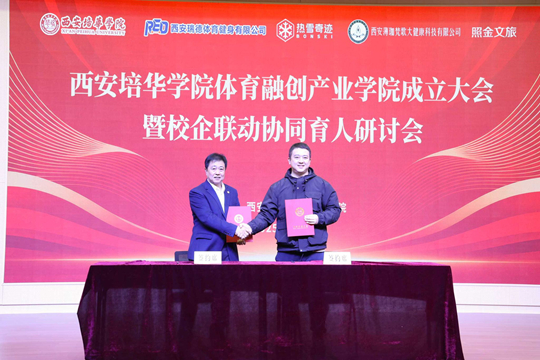 成立大会上,体育学院院长、体育融创产业学院管理委员会主任王志强与西安瑞德体育健身有限公司、西安雪迹体育发展有限公司、西安薄珈梵歌大健康科技有限公司、陕西照金文化旅游投资开发有限公司四家企业负责人现场签订校企合作协议,标志着各方将在人才培养、实践教学、科研转化等领域开展深度合作。