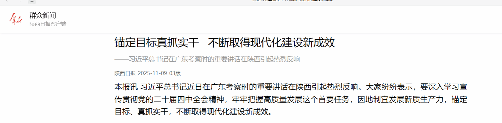 本报讯 习近平总书记近日在广东考察时的重要讲话在陕西引起热烈反响。大家纷纷表示,要深入学习宣传贯彻党的二十届四中全会精神,牢牢把握高质量发展这个首要任务,因地制宜发展新质生产力,锚定目标、真抓实干,不断取得现代化建设新成效。