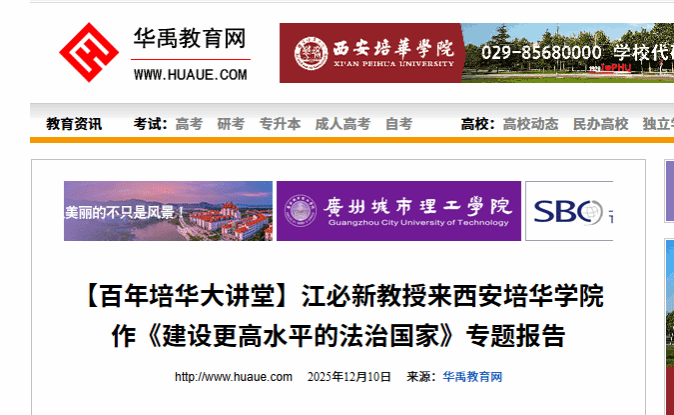 为深入学习贯彻党的二十届四中全会精神,全面落实“十五五”规划建议关于法治建设的决策部署,切实提升师生法治素养和理论水平,2025年12月8日,中国社会工作联合会副会长、第十三届全国人大宪法和法律委员会副主任委员江必新教授应邀来西安培华学院,围绕《建设更高水平的法治国家——兼谈“十五五”规划建议的法治精神》主题开展专题报告。《人民法治》杂志社社长兼总编辑梁相斌教授、融媒体编辑张元同志出席活动。西安培华学院理事长姜波、党委书记刘锋、副校长罗新远、理事会秘书长姜瀛初、法学院院长王鸿貌及各二级学院师生代表共计400余人参加报告会。报告会由常务副校长胡俊生主持。