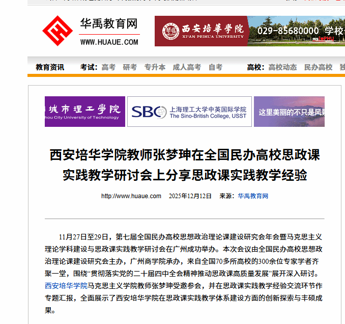 11月27日至29日,第七届全国民办高校思想政治理论课建设研究会年会暨马克思主义理论学科建设与思政课实践教学研讨会在广州成功举办。本次会议由全国民办高校思想政治理论课建设研究会主办,广州商学院承办,来自全国70多所高校的300余位专家学者齐聚一堂,围绕“贯彻落实党的二十届四中全会精神推动思政课高质量发展”展开深入研讨。西安培华学院马克思主义学院教师张梦珅受邀参会,并在思政课实践教学经验交流环节作专题汇报,全面展示了西安培华学院在思政课实践教学体系建设方面的创新探索与丰硕成果。