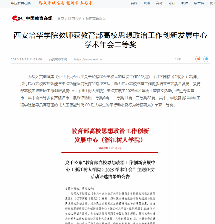 为深入贯彻落实《中共中央办公厅关于加强民办学校党的建设工作的意见》(以下简称《意见》)精神,探讨民办高校政治功能与组织功能协同发挥的路径方法,助力民办高校党建工作提质增效与高质量发展,教育部高校思想政治工作创新发展中心(浙江树人学院)组织开展了2025学术年会主题征文活动。经过专家盲审、集中会审等多轮严格评审,最终评选出一等奖6篇、二等奖11篇、三等奖22篇。其中,西安培华学院智能科学与工程学院辅导员高珊珊的《人工智能时代 00 后大学生的思想动态及行为特征研究》荣获二等奖。