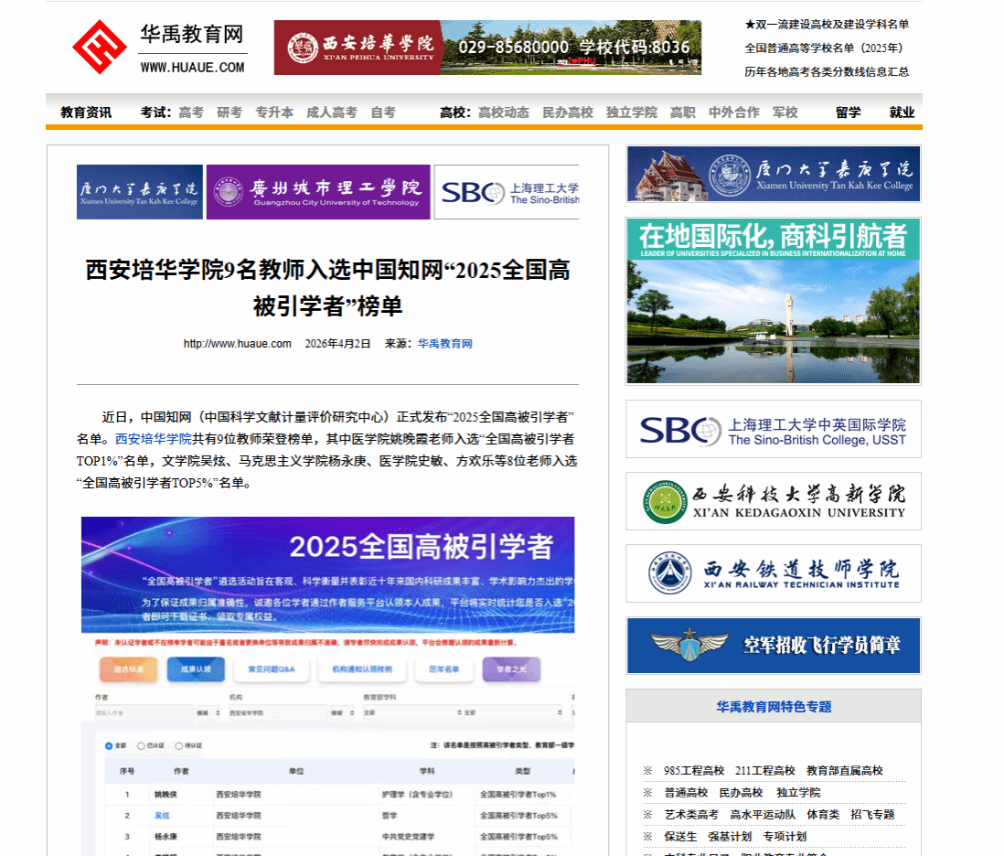 近日,中国知网(中国科学文献计量评价研究中心)正式发布“2025全国高被引学者”名单。西安培华学院共有9位教师荣登榜单,其中医学院姚晚霞老师入选“全国高被引学者TOP1%”名单,文学院吴炫、马克思主义学院杨永庚、医学院史敏、方欢乐等8位老师入选“全国高被引学者TOP5%”名单。